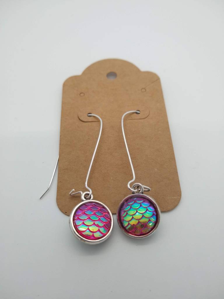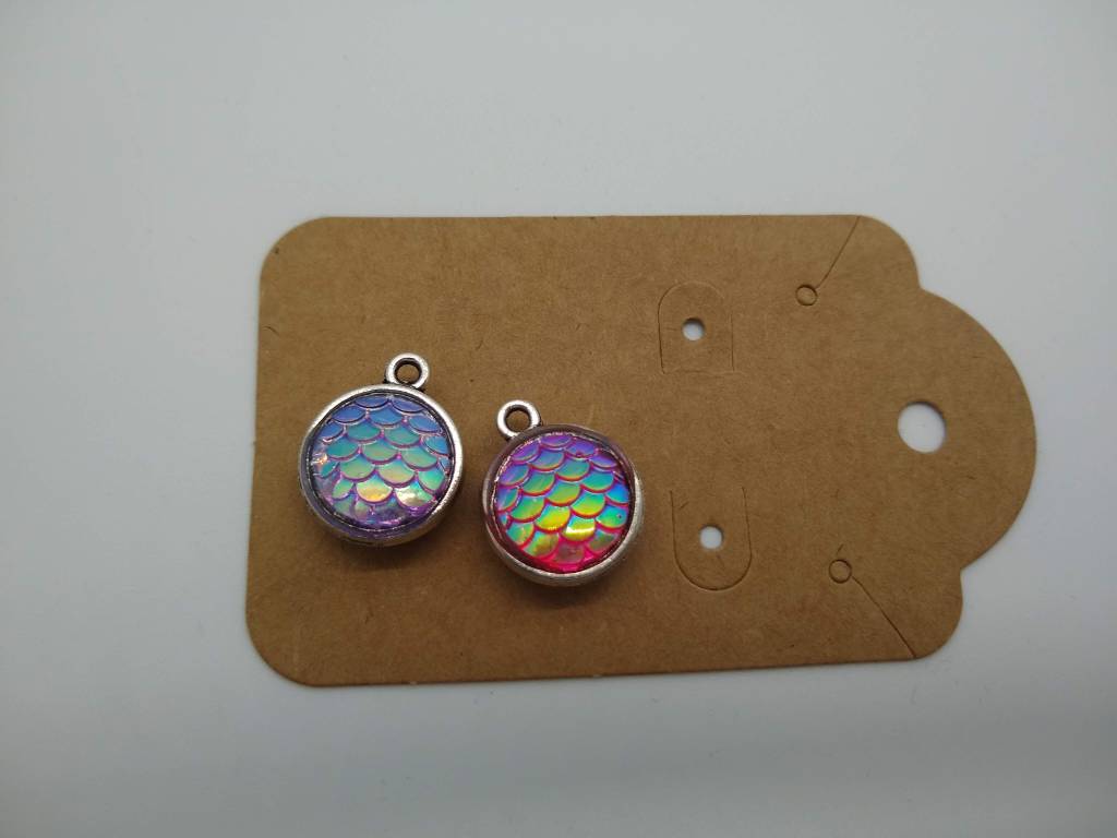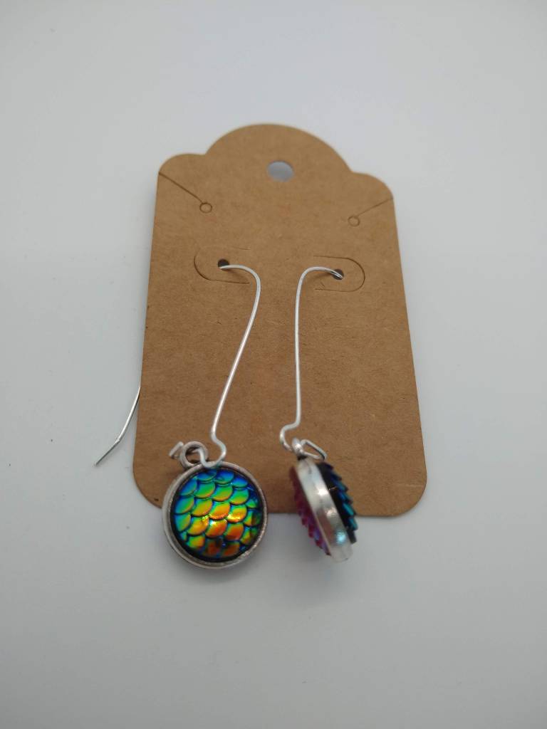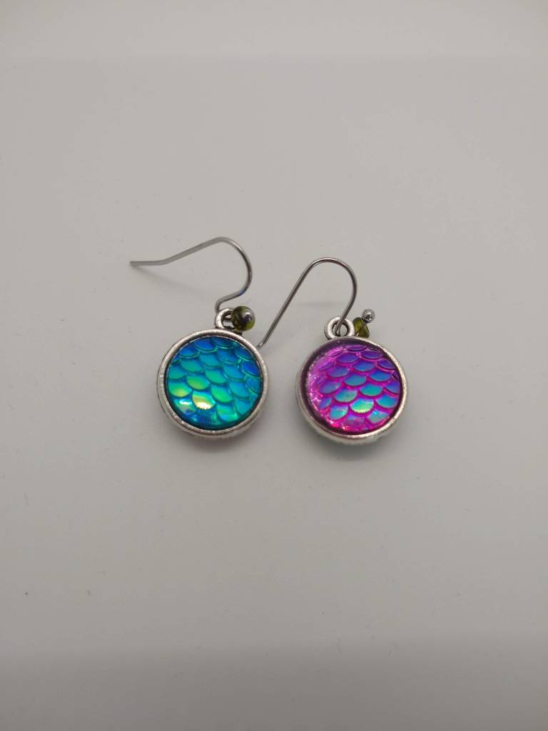 Iridescent resin “scales” are set in silver-plated double-sided trays. Available on stainless steel french hooks or smaller S-hooks, these earrings can be easily slipped off and reversed to show a different color scale on the other side.