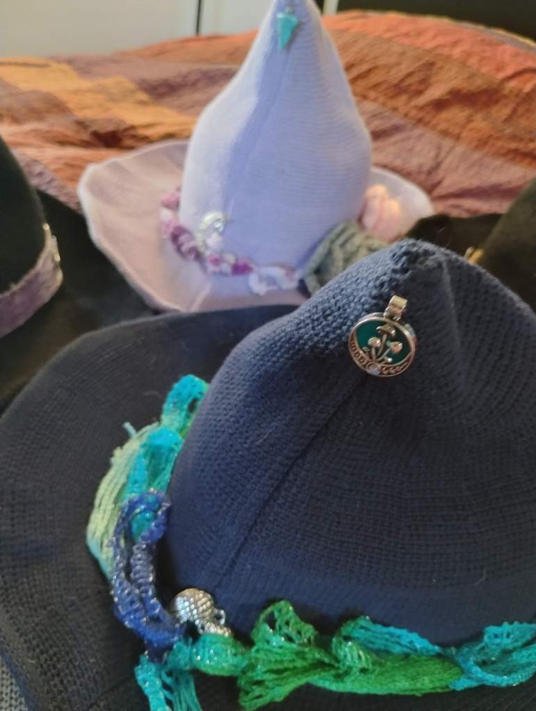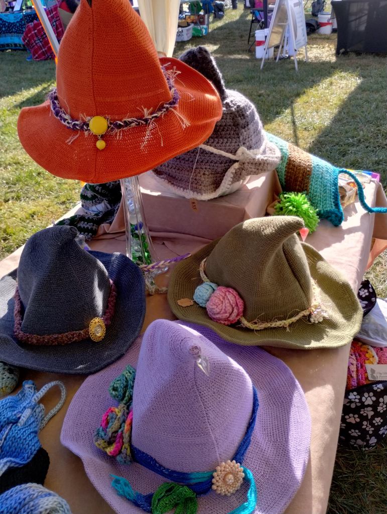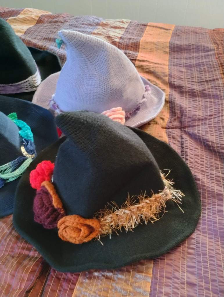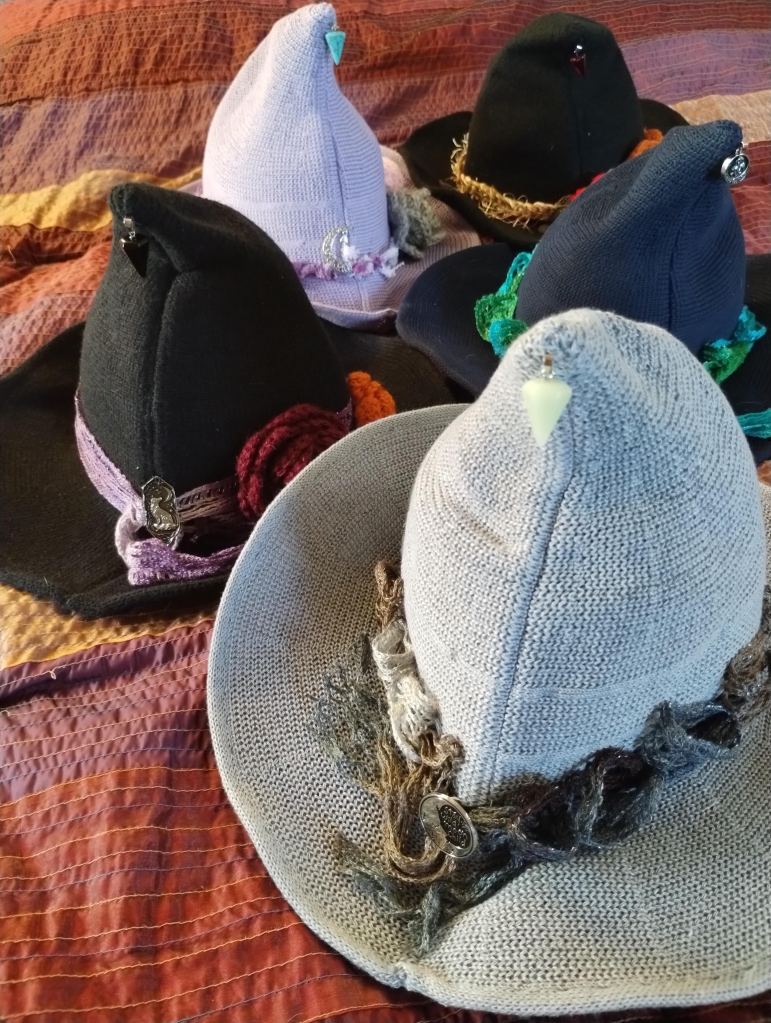 Machine knitted hats embellished with crocheted bands and flowers, charms, pins, and vintage jewelry pieces. Each one is unique! Available at the Bristol Boo-tique and at my upcoming events.
