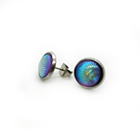 Resin cabochons about 1cm (10mm) across are patterned like seashells and set in stainless steel earring stud. Available in multiple colors.