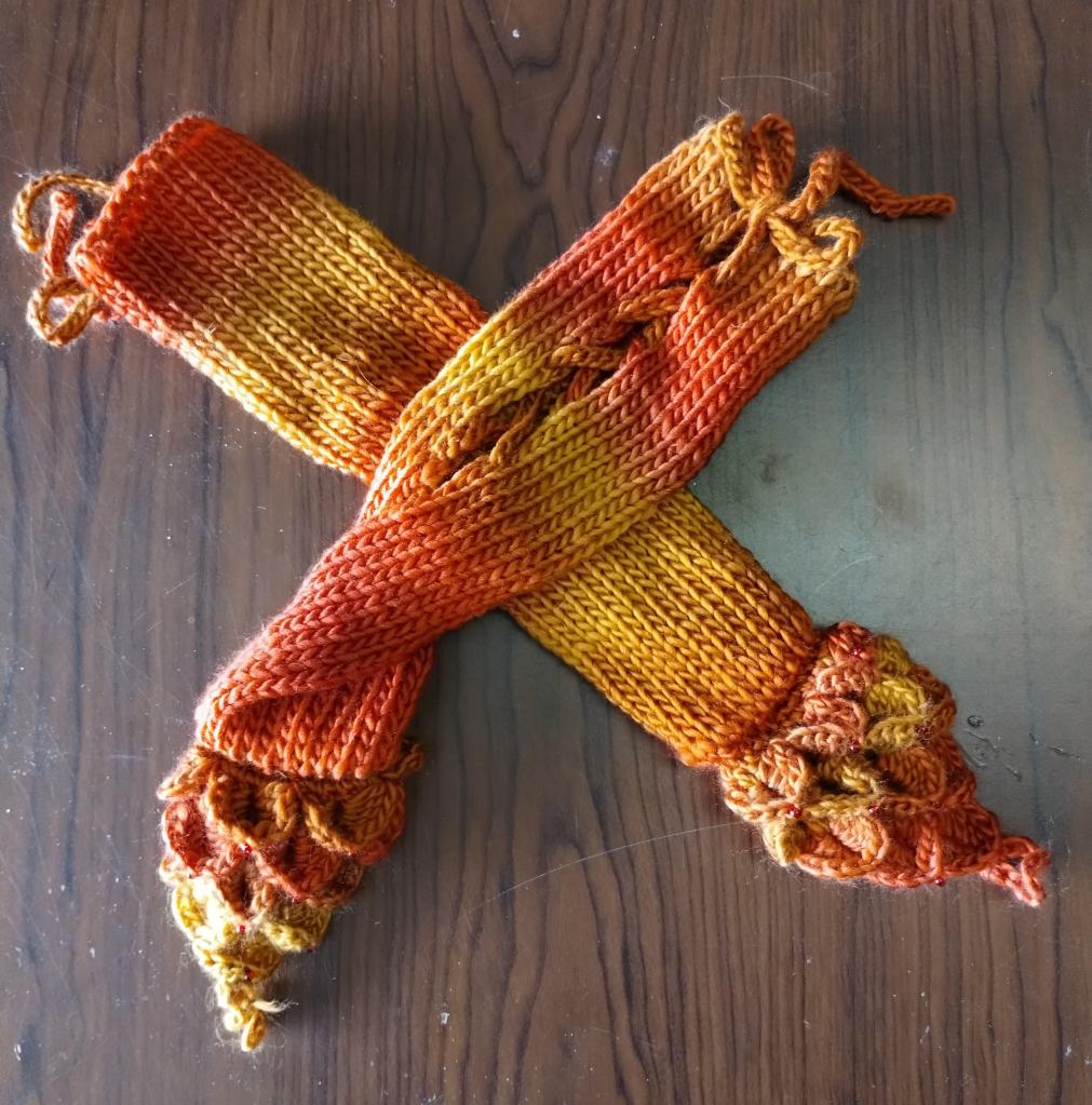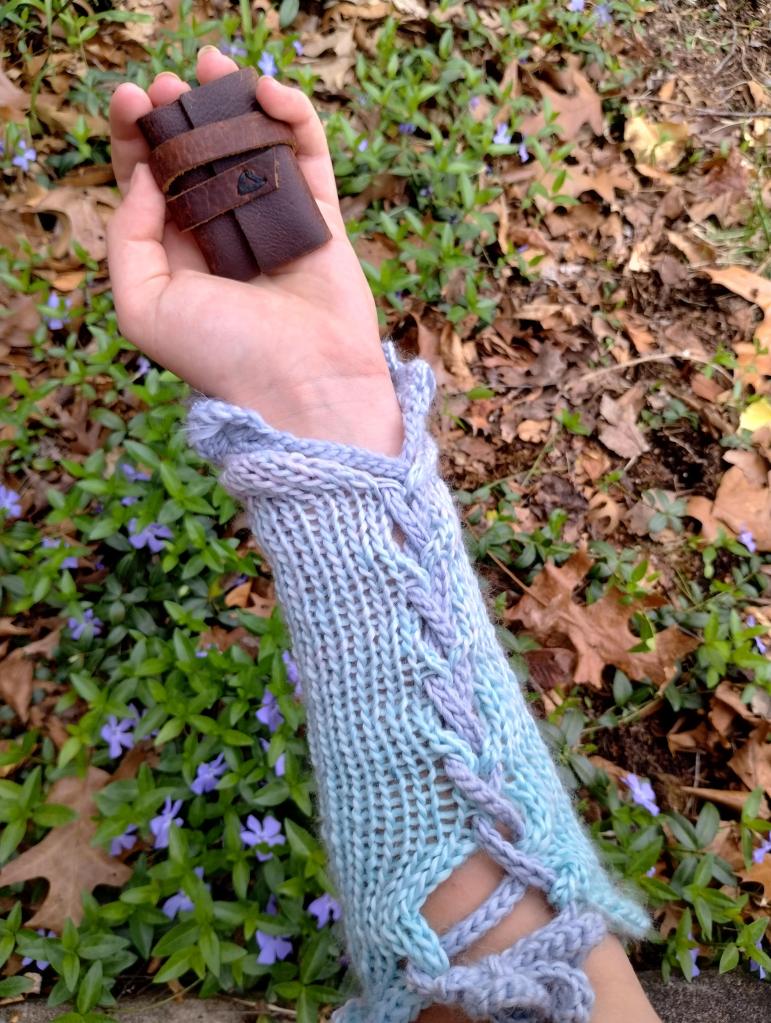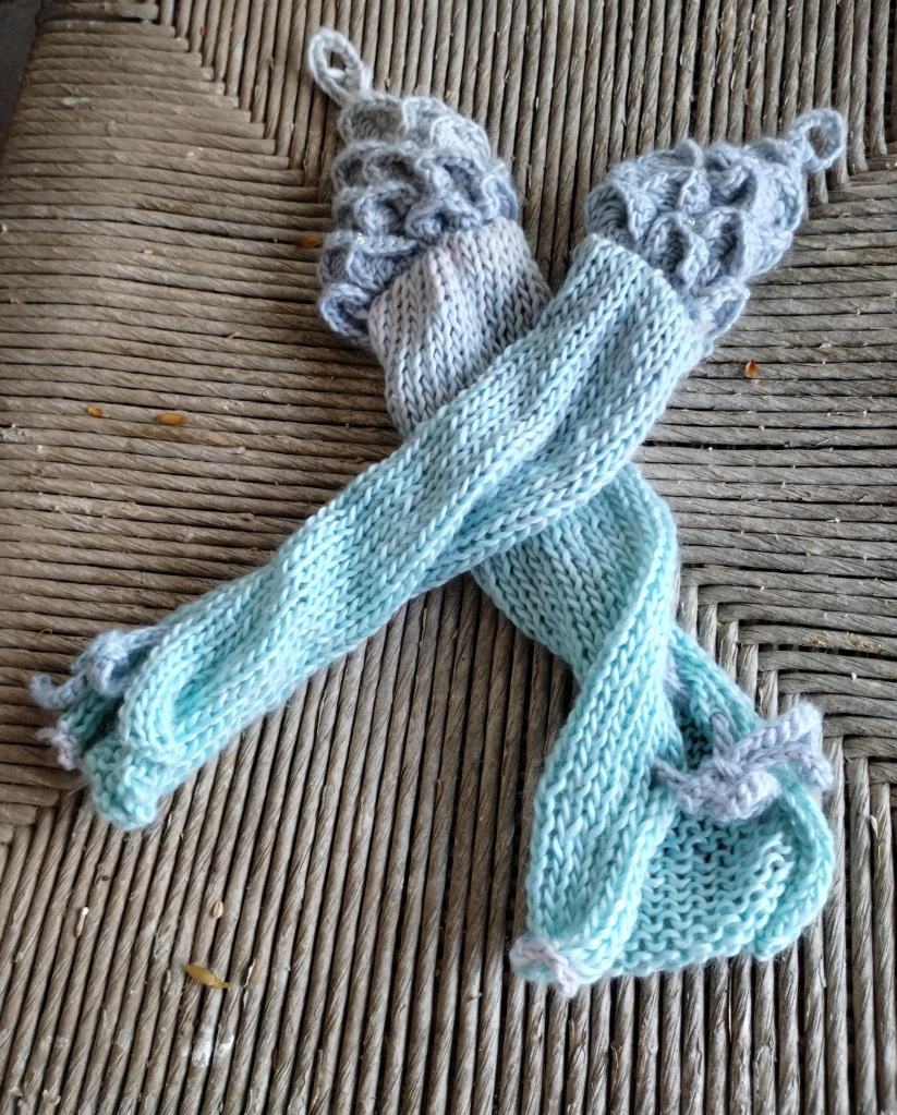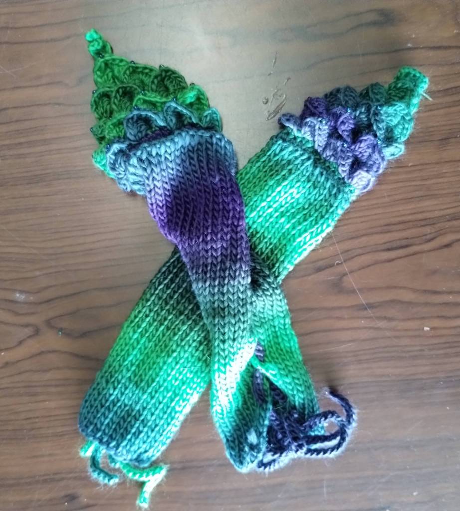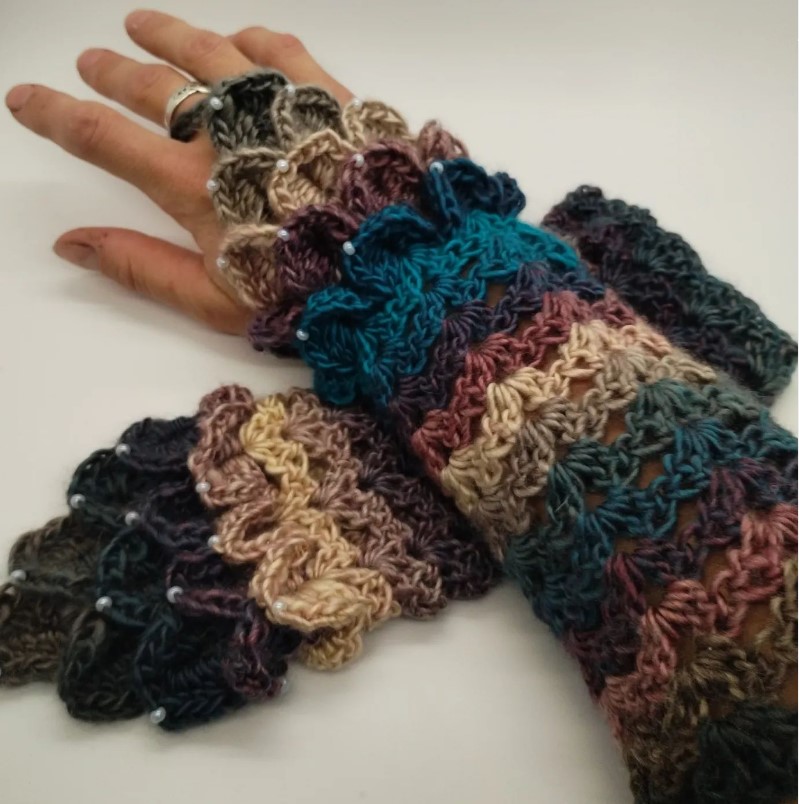 Hand crocheted scales transition to lacy arm warmers that come halfway to the elbows. Embellished with tiny glass beads at the point of the “scales”, these gauntlets are a wonderful accessory for your inner mermaid or dragon. Custom colors and sizes available on request, Hand wash. I’ve begun making these with knitted sleeves and a lace up element to make them more free size.